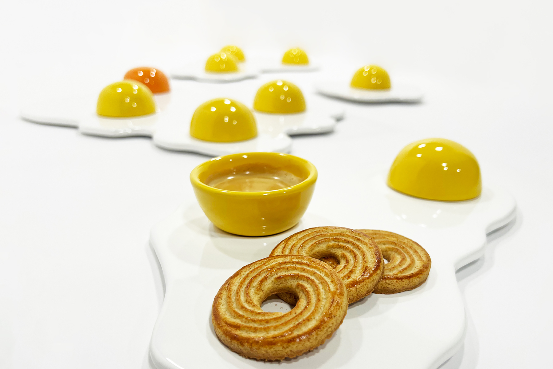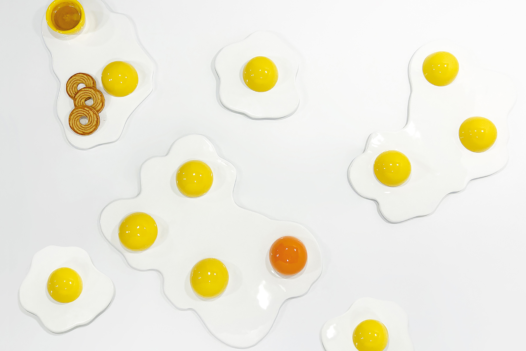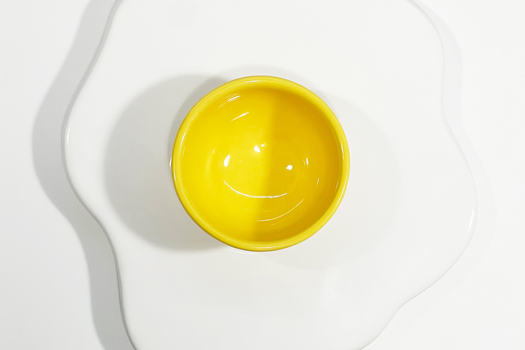 The cups, without handles and shaped like egg yolks, are integrated into a tray that recalls the shape of the egg white, creating a harmonious and recognizable composition. Extremely versatile, EGGOLO! also lends itself as a gravy boat, biscuit holder or centerpiece for finger food, thanks to the modularity of its elements.