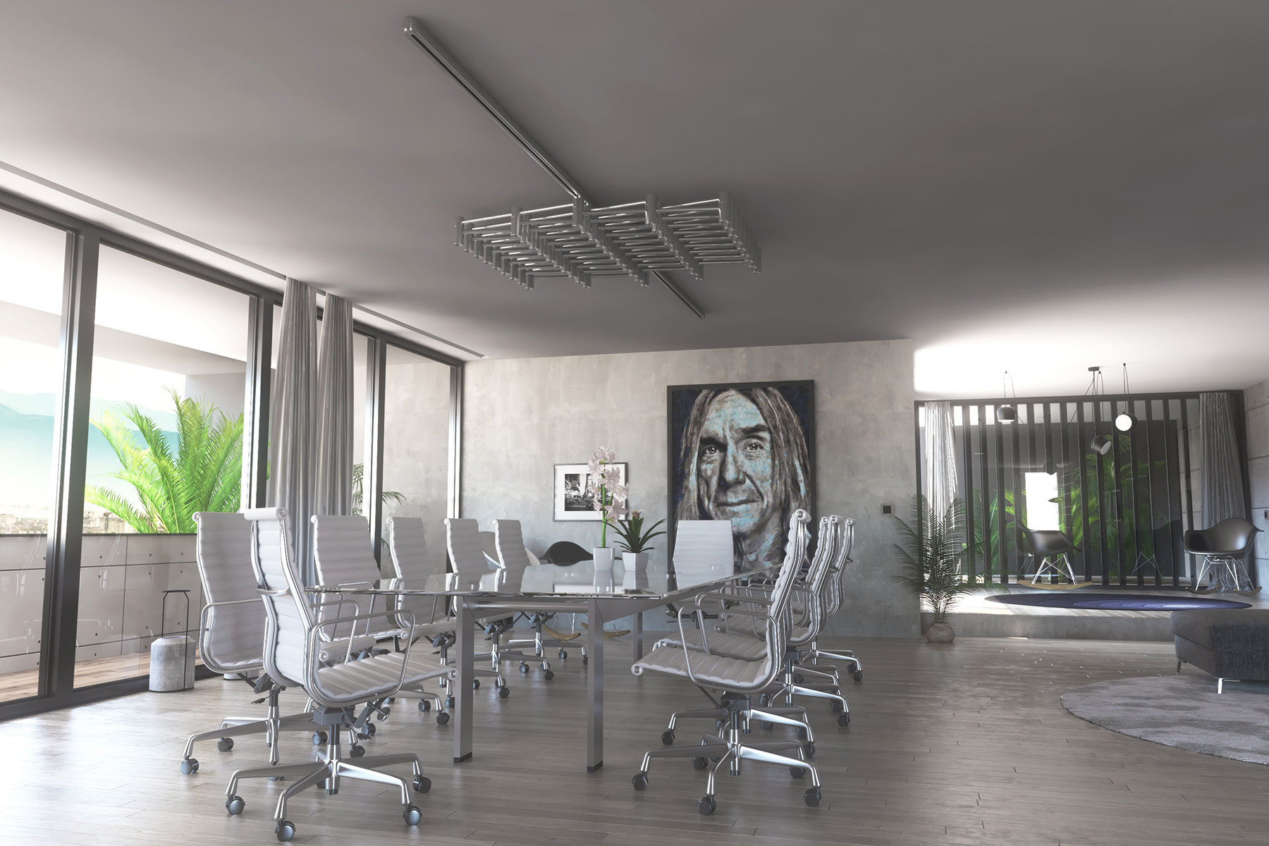 A pantograph system opens or closes by sliding on a ceiling- or wall-mounted track. This mechanism alone is a piece of furniture itself. L-Amp can be customised based on the space to be illuminated.